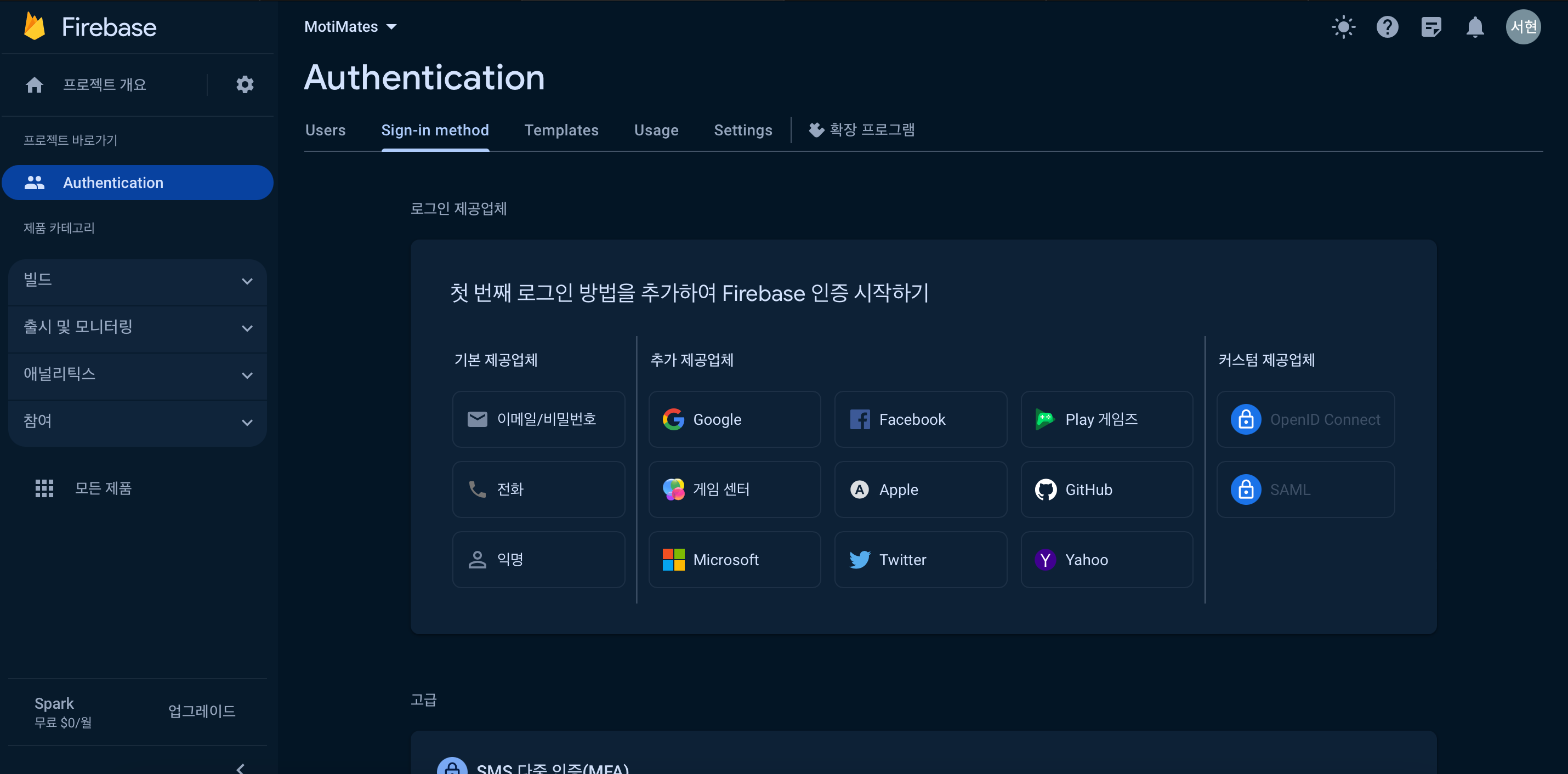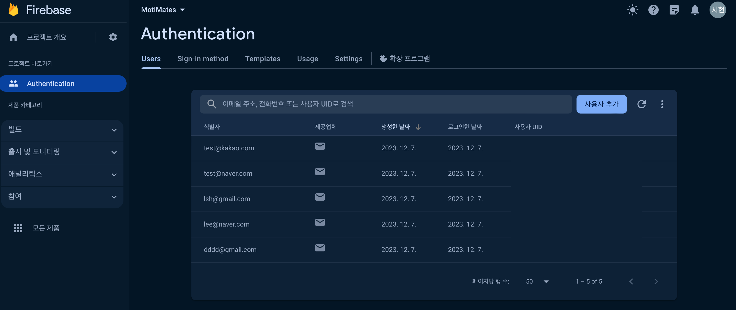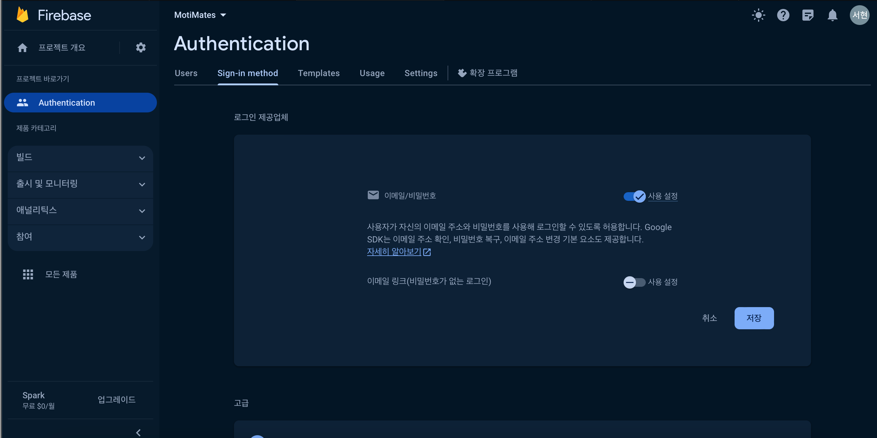 이메일/비밀번호 사용 설정 켜주시면 파이어베이스 설정은 끝입니다.