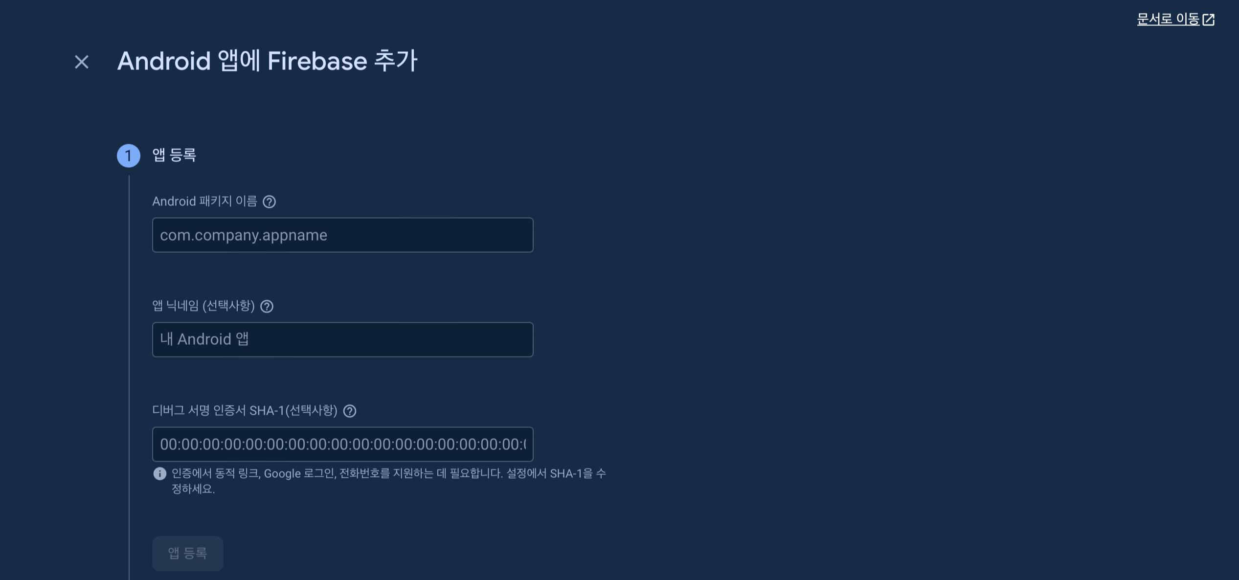 이런 화면이 나올텐데, 패키지 이름과 닉네임을 작성하시고 SHA-1 작성해주시면 됩니다.