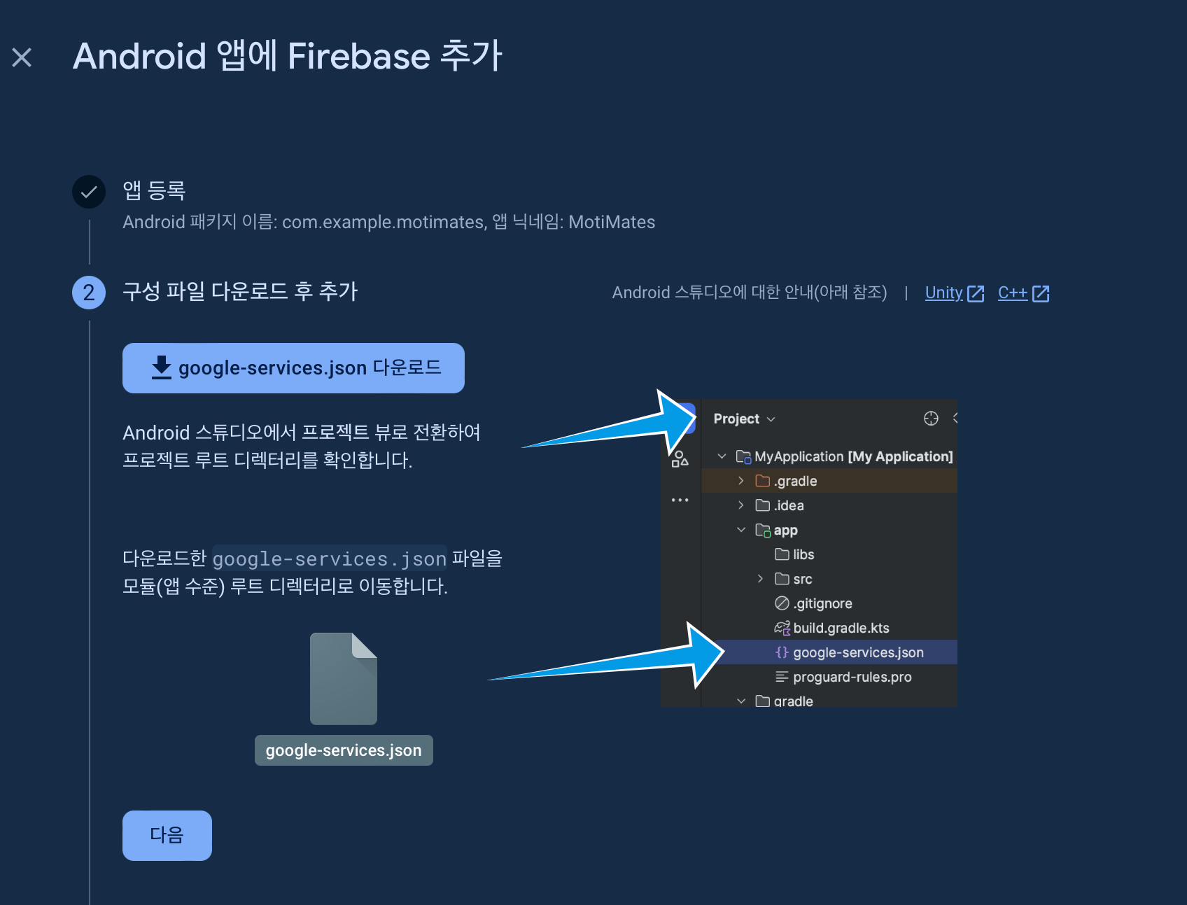 그 다음 google-services.json 다운로드 버튼을 누르고 json 파일을 다운받습니다.